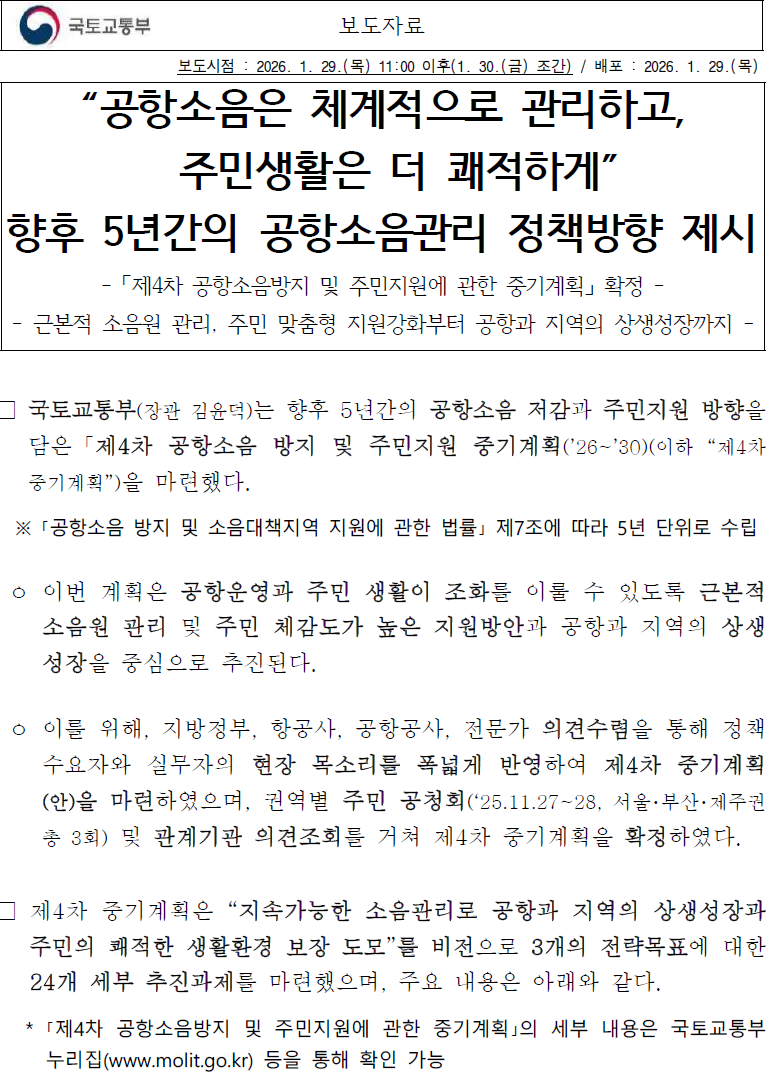 국토교통부에서는 제4차 공항소음방지 및 주민지원에 관한 중기계획을 확정하였습니다.