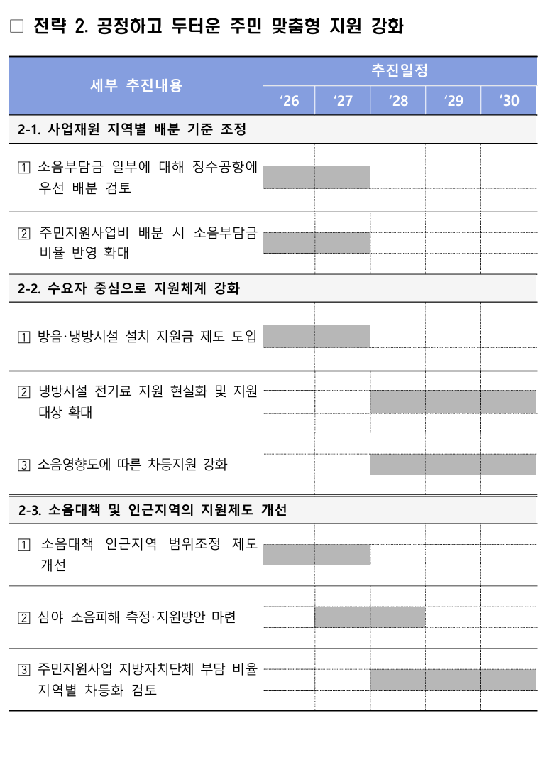 ㅇ 방음・냉방시설 설치 지원금 제도 도입- 방음・냉방시설을 주민이 직접 설치하고 그 설치비용을 사후에 정산할 수 있도록 하여 시설 설치율 및 주민 만족도 제고 추진 ※ 한편, 10년 이상 경과되어 재설치가 필요한 냉방시설에 대한 지원기준 마련도 추진