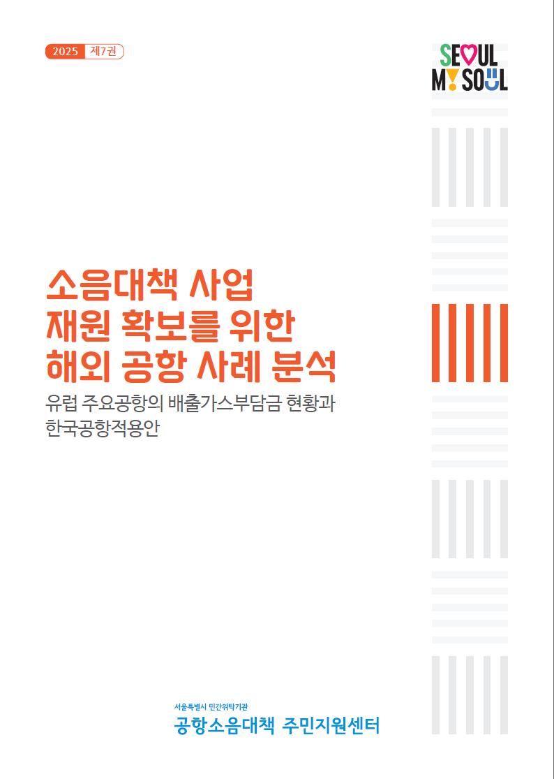 안녕하세요 서울특별시 공항소음대책 주민지원센터입니다 우리 센터에서는 공항 소음 대책 사업의 안정적인 재원 확보 방안을 모색하고자 2025년 신규 연구자료 소음대책 사업 재원 확보를 위한 해외 공항 사례 분석 을 발간하였습니다 본 연구자료는 유럽 주요 공항에서 운영 중인 배출가스 부담금 제도 를 집중 분석하고 이를 국내 공항 실정에 맞춰 적용할 수 있는 구체적인 방안을 담고 있습니다 주민